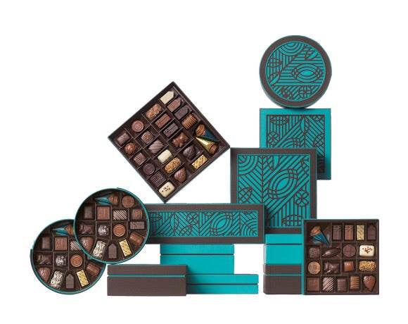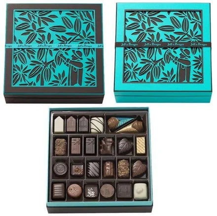 أنواع مشكلة من شوكولا جيف دي بروج الطبيعية 48 قطعة تقدم في بوكس راقي بلونين البني الغامق واكوابلو.